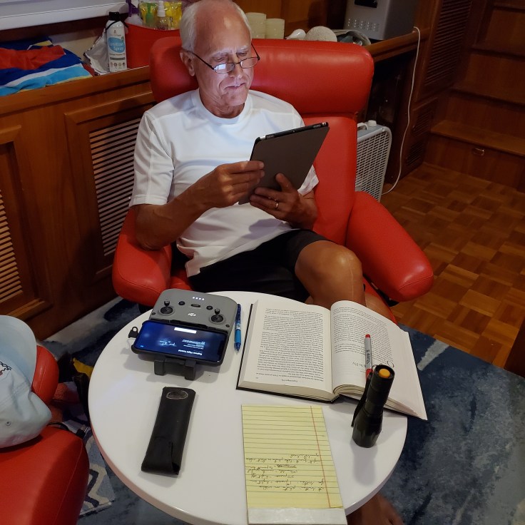 Scott is learning the new skill of using a drone AND he has mastered a new button on the microwave! He can now use the Time/Cook feature! I have learned how to tie two knots, the clove hitch for tying onto a post and the rail wrap clove for attaching the fenders to the rails. I have intended to master these knots for years but we kept forgetting. True confession…I live on a boat but am not really a swimmer. So, at long last, I have forced myself to learn to put my face under water and learn to swim laps. I can’t say I enjoy it but it is a good workout!