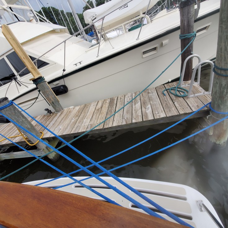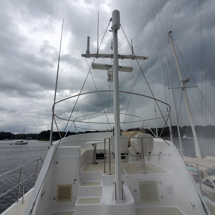Right after our arrival here we had a little visit from Tropical Storm Isaias for which we were totally over prepared. Although we didn’t sit and stare at the wind gage during the storm, (we were busy practicing yoga and Zumba https://ztsfitness.com/), when we did check it, the highest gusts we saw were 48 knots. We had spent most of the previous day doubling the lines, removing the bimini/cushions, and adding fenders for naught. Although we all know it’s better to be over-prepared than under-prepared.