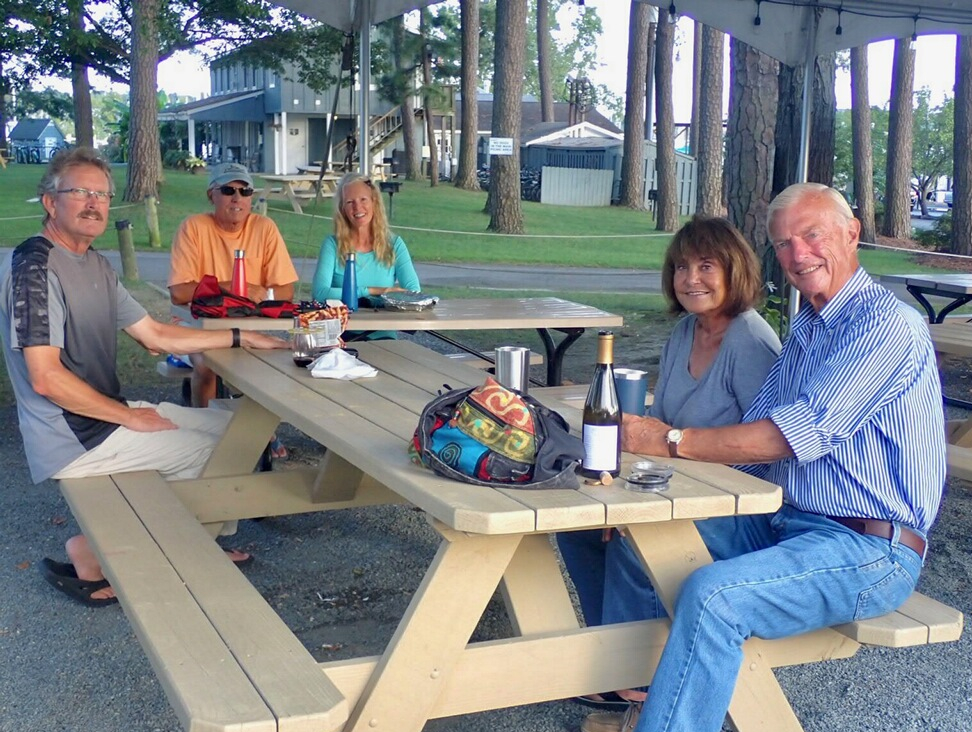 For 2 days Scott spoke with Mr. Parks, the owner of the marina, about our draft (depth of the boat) as we had heard stories of shallow waters there. We reiterated that we had a 6′ draft, although it is only 5’6″, and were guaranteed that there would be enough water. We timed our arrival on an incoming tide that was half up …….. As were were sidling into our spot on the dock WE GOT STUCK in mud in 4’6″ of water!!!!!!! We were so upset since we just had our bottom parts painted in July! Back into the Bay we headed with no Plan B. We cruised back across the bay and settled into the Piankatank River, in another lovely anchorage near Deltaville. One afternoon we enjoyed a fun happy hour outdoors with friends at Deltaville Marina while exploring by dinghy. We have not given up on Tangier Island, in fact, next time we will take our bikes so we can explore more of the area.