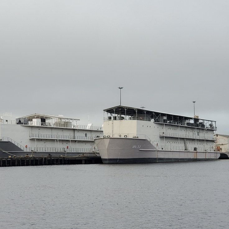 We haven’t had the pleasure of walking pristine beaches for quite awhile so our plan was to spend some quality beach time on our way south. Our first stops were uneventful, near Deltaville Marina and in Norfolk, VA. I’m always intrigued by Norfolk because the humongous Navy ships are amazing. We had never seen so many in port as we did this time. It’s possible to get up close and personal with container ships and a variety of boats, including floating dorms.