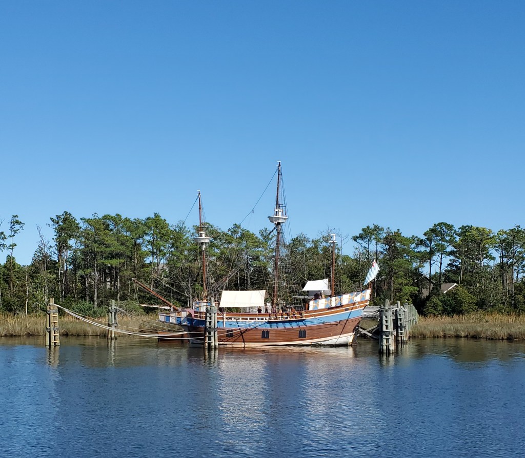 Charming and enchanting aptly describe this lovely town on Roanoke Island. We added an extra day to our downtown dockage located across from the Elizabeth II, a representation of the original English merchant vessels, and the Roanoke Island Festival Park. With a short walk across the bridge to the park and we learned about the island’s history from the angles of both the local Algonquin Indians and the early voyagers from England. The Fort Raleigh National Historic Site was an easy 3 mile bike ride away via a great bike path. There we learned about the first British colony in 1854 which was lost.