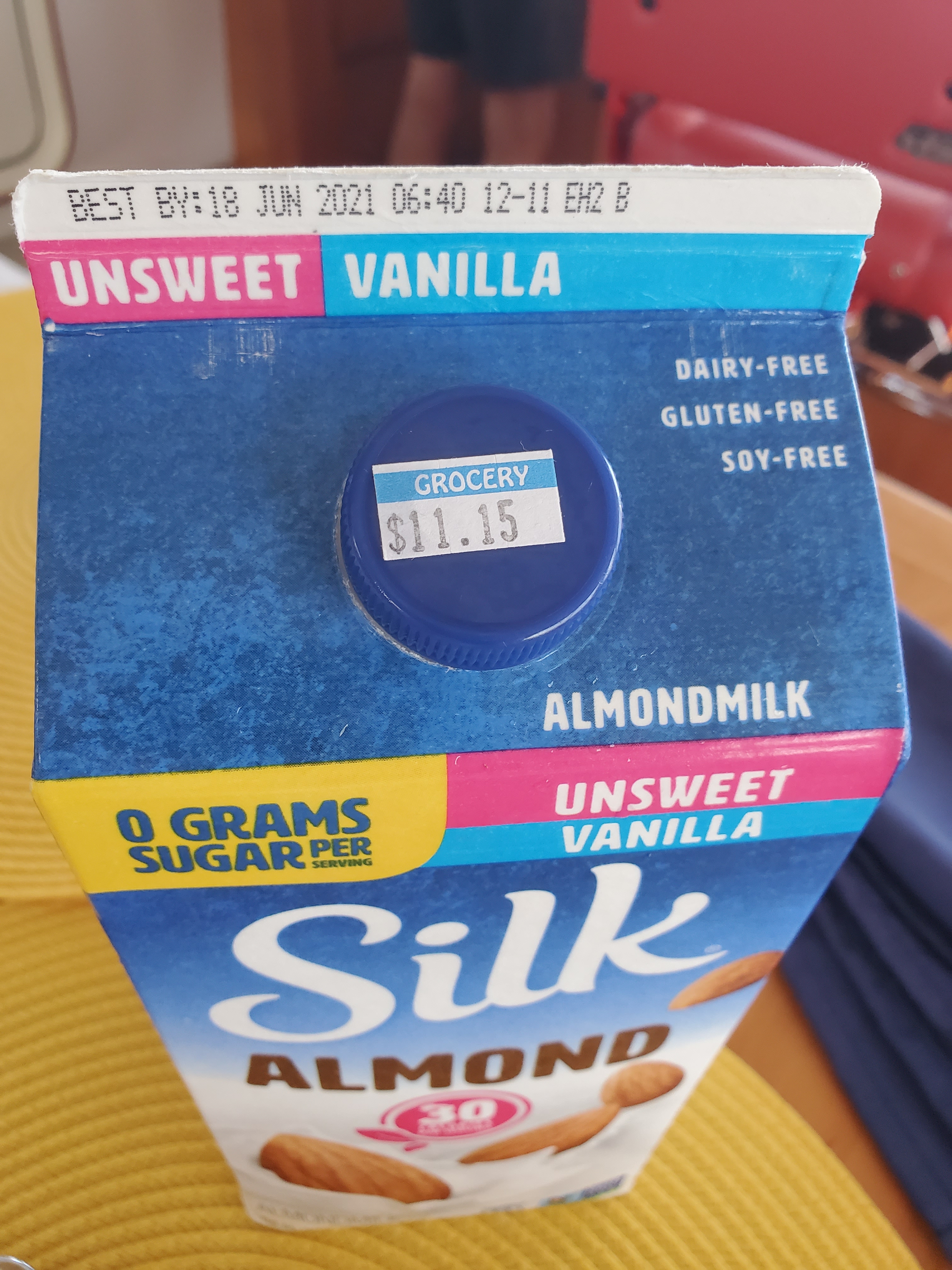 Fast forward to our arrival in Cape Canaveral. The very first thing I did, even before napping, was to make an appointment to get my second vaccine. I’m soooo glad that is complete. Instacart delivered loads of fruits and vegetables. Scott got his first professional hair cut in 1.5 years. I took stock of the pantry, storage under the settee, and under some of our steps. I found quite a nice stash of dark chocolate. Either I paced myself and ate with self-control or one might say that I was scared I would run out and completely over stocked. I’m going with the first option! Note the price of the almond milk from the Bahamas compared to only $1.99 at Aldi’s. In addition, their tax is 12%.