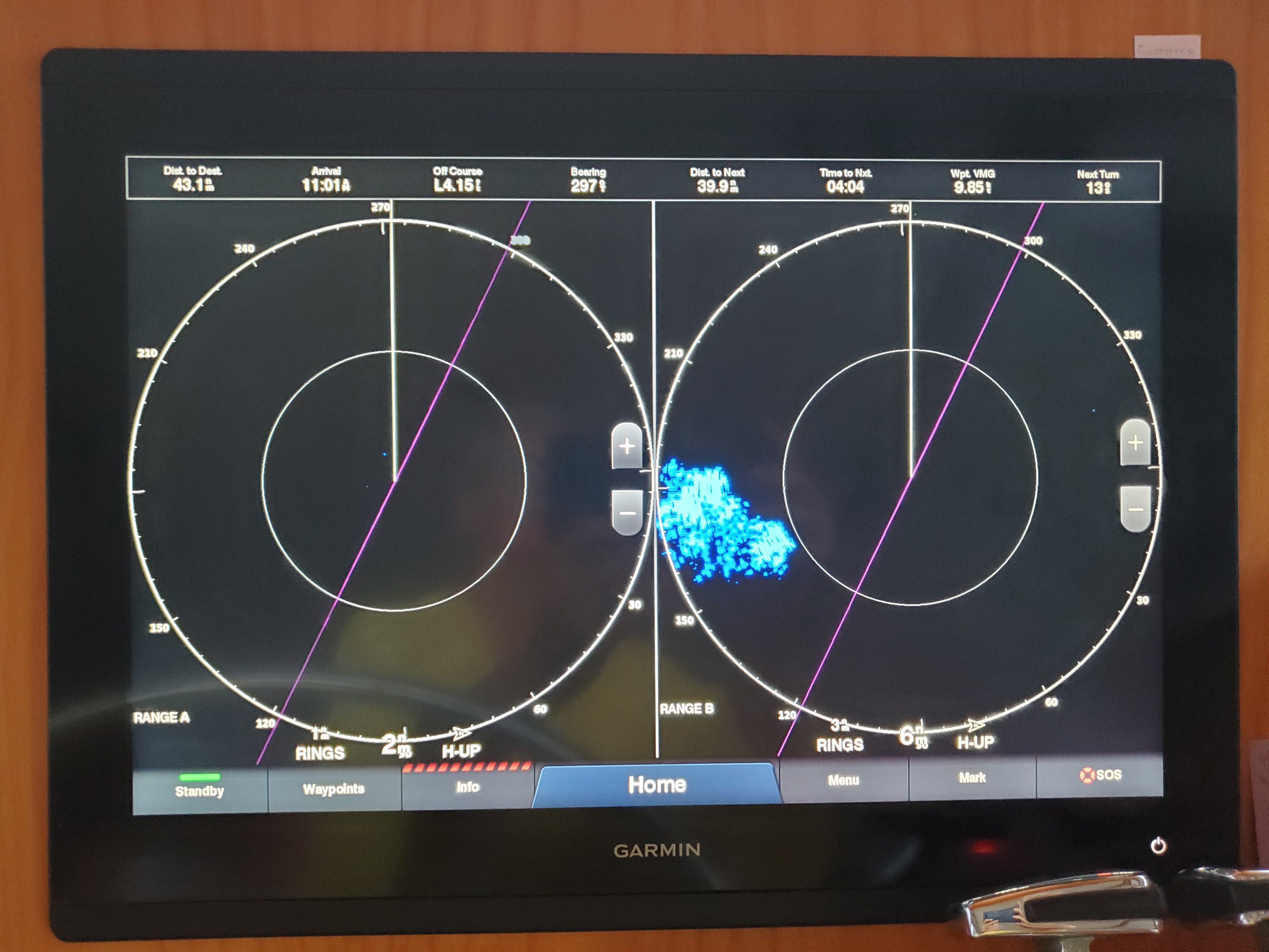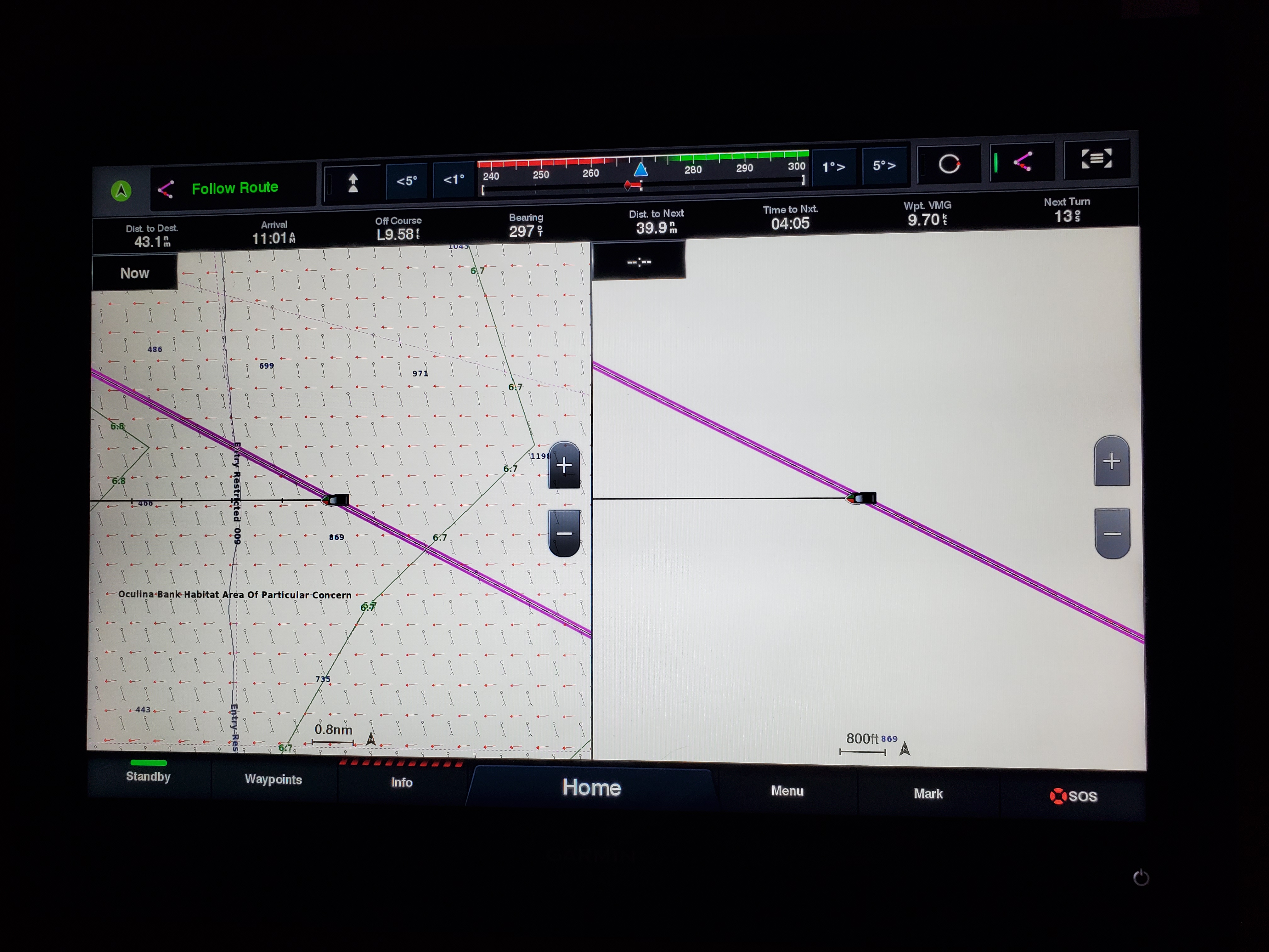 We had a beautiful overnight crossing with perfect weather. I slept from 9 p.m.-2 a.m. and Scott’s shift was from 2:30-7:30 a.m.. Most people take shorter shifts, but this seems to work best for us, and then we take a nap during the day. We had to cross the Gulf Stream which runs mostly parallel to the US coast. In order to make landfall where we wanted to, we had to cross it and counter its current pushing us North. The two screen shots show the extent of the crabbing the boat had to do to stay on our route line. Both the radar and the chart show about 30 degrees to port. We were headed NW so the boat was steered 30 degrees into the current and we stayed on our route. The fish were biting and we caught yet another barracuda and a nice King Mackerel. Before we knew it we were at Cape Marina in Cape Canaveral.