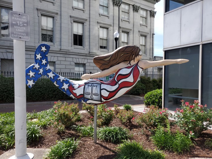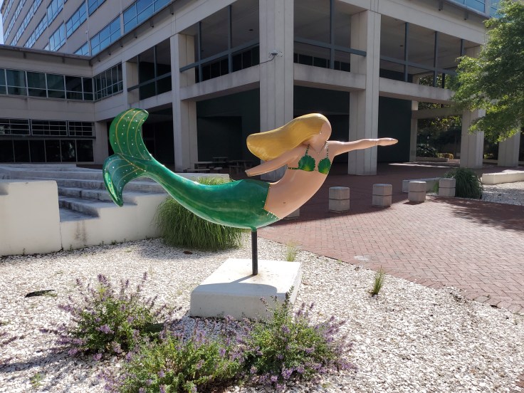 In Norfolk we spent several days at the downtown marina, Waterside, where there are many restaurants and bars near the waterfront. We enjoyed an overnight visit from daughter, Allegra and her boyfriend, Brandon. Oh, the joy of hugging family and spending quality time…close together and inside the boat! Being on opposite sides of the aft deck in the hot sun or blowing rain just doesn’t compare. We walked a few miles of the Cannonball Trail through the lovely and clean downtown center. We discovered the peace and beauty of the Pagoda and Oriental Garden Foundation which is an oasis of tranquility and bird songs. However, my favorite part of Norfolk are the iconic symbols of the city…mermaids.