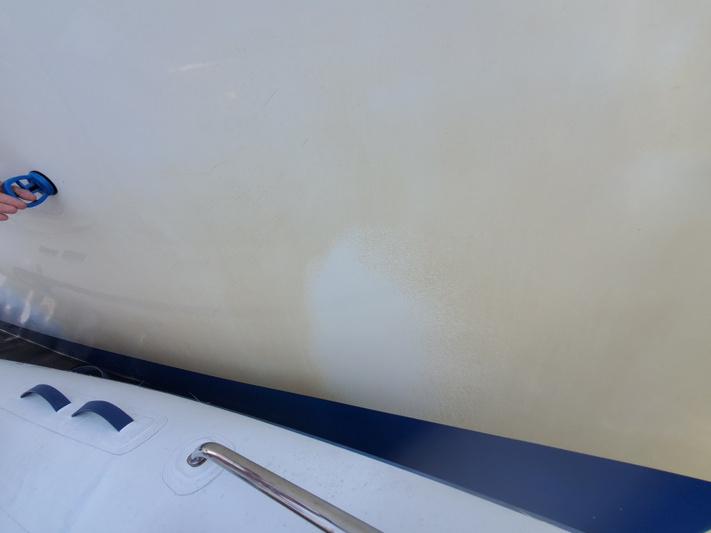 I hold onto the hull with suction cups while Scott sprays…instant results!