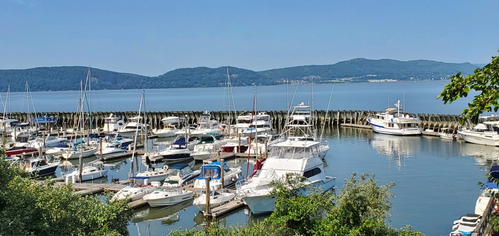 With four more nights until we check-in at Liberty Landing Scott suggested heading up the Hudson River. Great idea! We had visited Cold Spring via train for our first New Year’s Eve in 2013 and had seen many picturesque areas along the way. Now we are docked at Croton-On-Hudson at the widest point of the river, 3.6 miles. We walked 3.5 miles uphill with our picnic lunch (in the 94* weather) to the Croton Dam Park, the first large masonry dam in the US. Scott gets into things like this and he quizzed the warden. The waterfall truly was lovely, as was the park. We, however, were sweaty pigs when we arrived home via Uber! Scott couldn’t resist crossing the Hudson to dine at the Hudson Water Club in Haverstraw, NY for drinks and apps. We may not be able to visit PEI this summer but polished off a lot of PEI mussels.