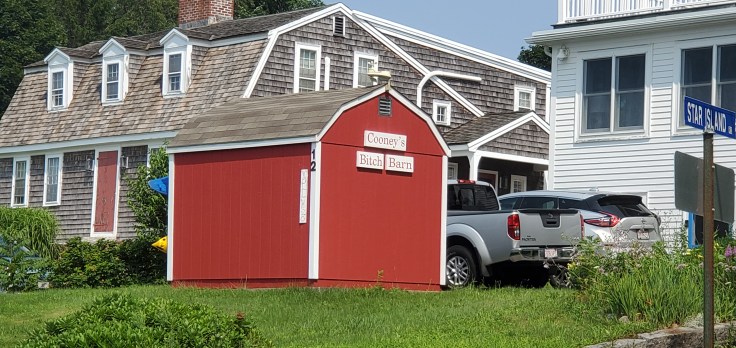 We “celebrated” our fifth anniversary, and I use that term loosely, at the island of Cuttyhunk, MA.  We had heard so many wonderful things about Cuttyhunk and had put it on our “must see” list.  We anchored outside the harbor, and took the dinghy in for our anniversary dinner.  What a surprise when our celebratory dinner meant eating at a seafood shack on the dock, seated at a dirty, moldy, picnic table, with the smell of rotting oysters, on a dry island.  No glass of wine or beer with dinner, in fact, we didn’t drink a drop of liquid and were back on the boat by 7 p.m.  because the seafood shacks closed between 6-6:30 p.m.  Our taste buds were all ramped up for a warm, buttered lobster roll but they were charging $38!  No way was I going to pay $38 for a lobster roll that doesn’t even come with sides!!!  Oh, well, the stuffies (stuffing with quahog clams) were pretty good as was the shrimp cocktail.