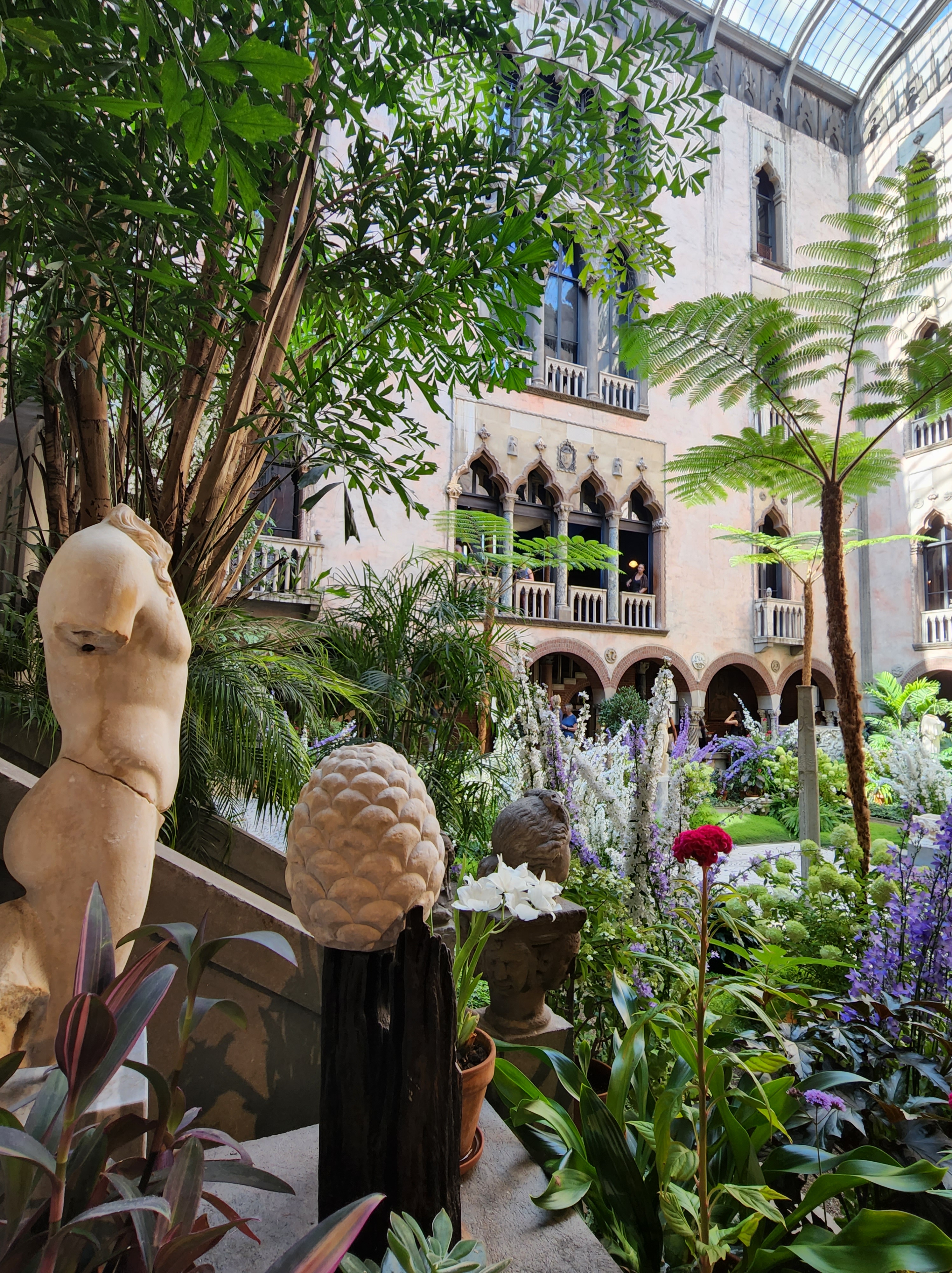 The Isabella Stuart Gardner Museum was our cultural experience one afternoon. Isabella was a patron of the arts and she curated her collection of books, art, and furniture. The rather nondescript building on the outside houses an interior courtyard based on Venetian palazzos filled with gorgeous flowers and sculptures. Before her death she arranged and edited her collection then stipulated in her will that nothing in the galleries could be changed and no items could be acquired or sold. Thus, in 1990 when 2 thieves stole 13 works of art (the largest property theft in the world) the works were not replaced. To date these works have not been recovered and one can see the empty frames where the thieves cut the canvases out of their frames. As seen in the center picture the lighting is somewhat dark compared to typical museums. I found it interesting that Isabella did not label her objects as she wanted the art to be experienced with an emotional response rather than an intellectual one.