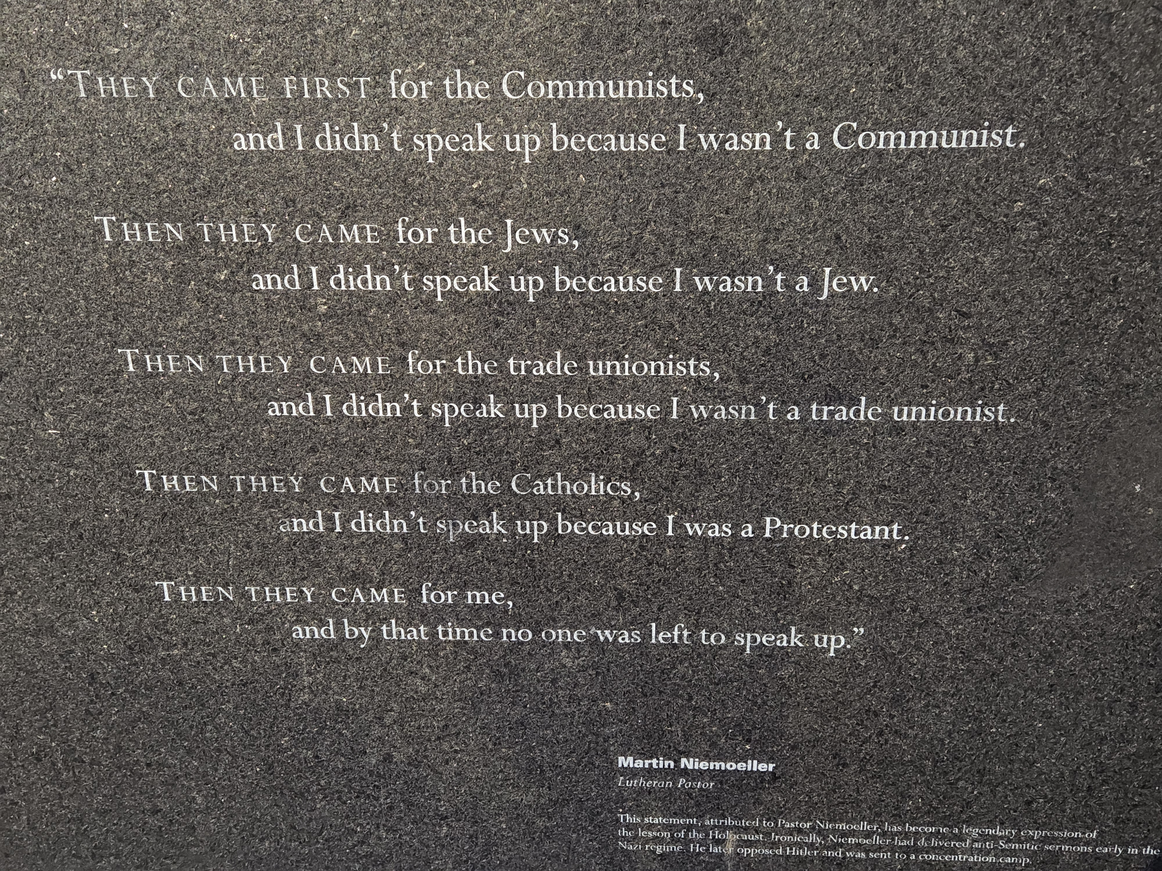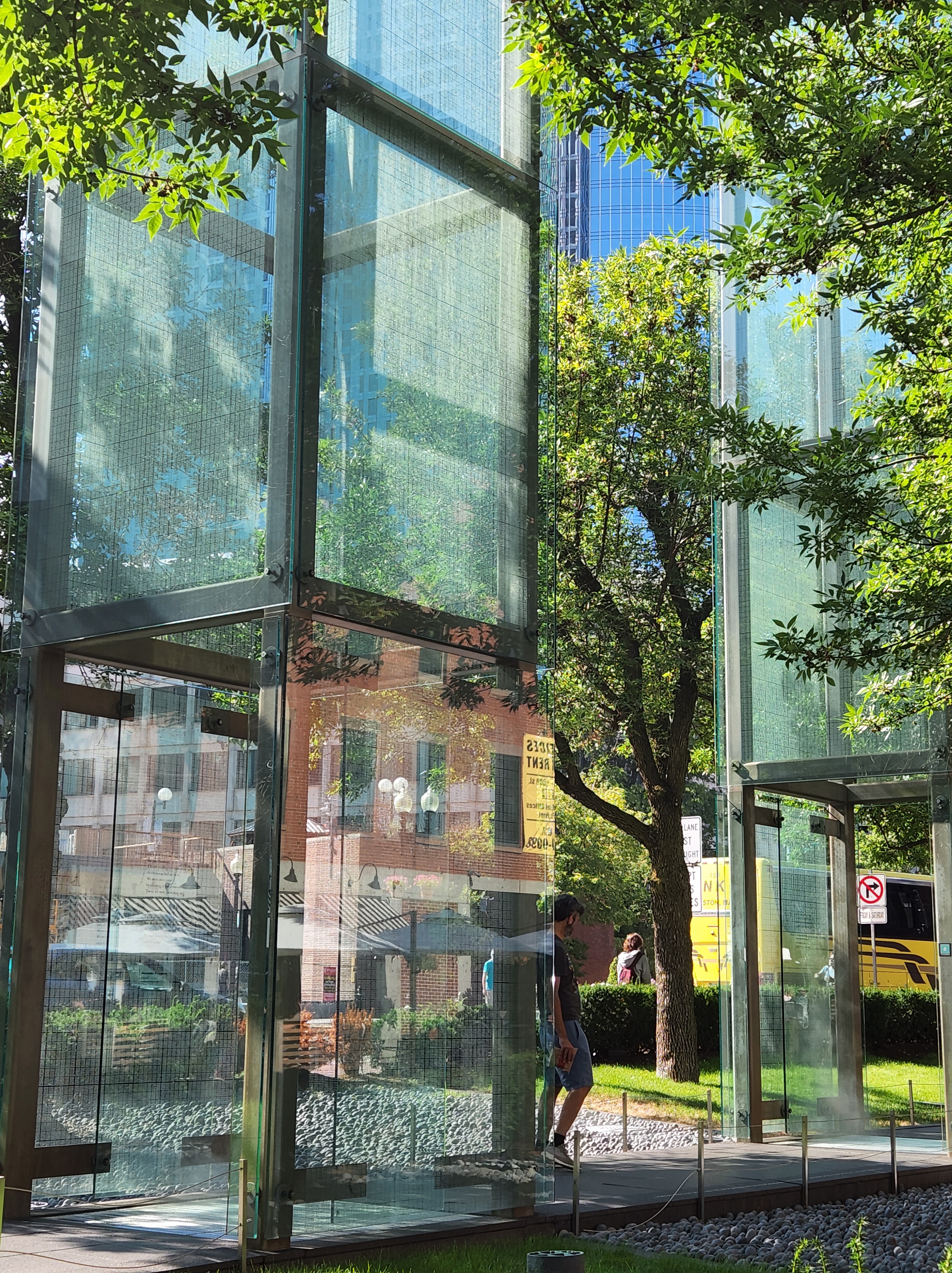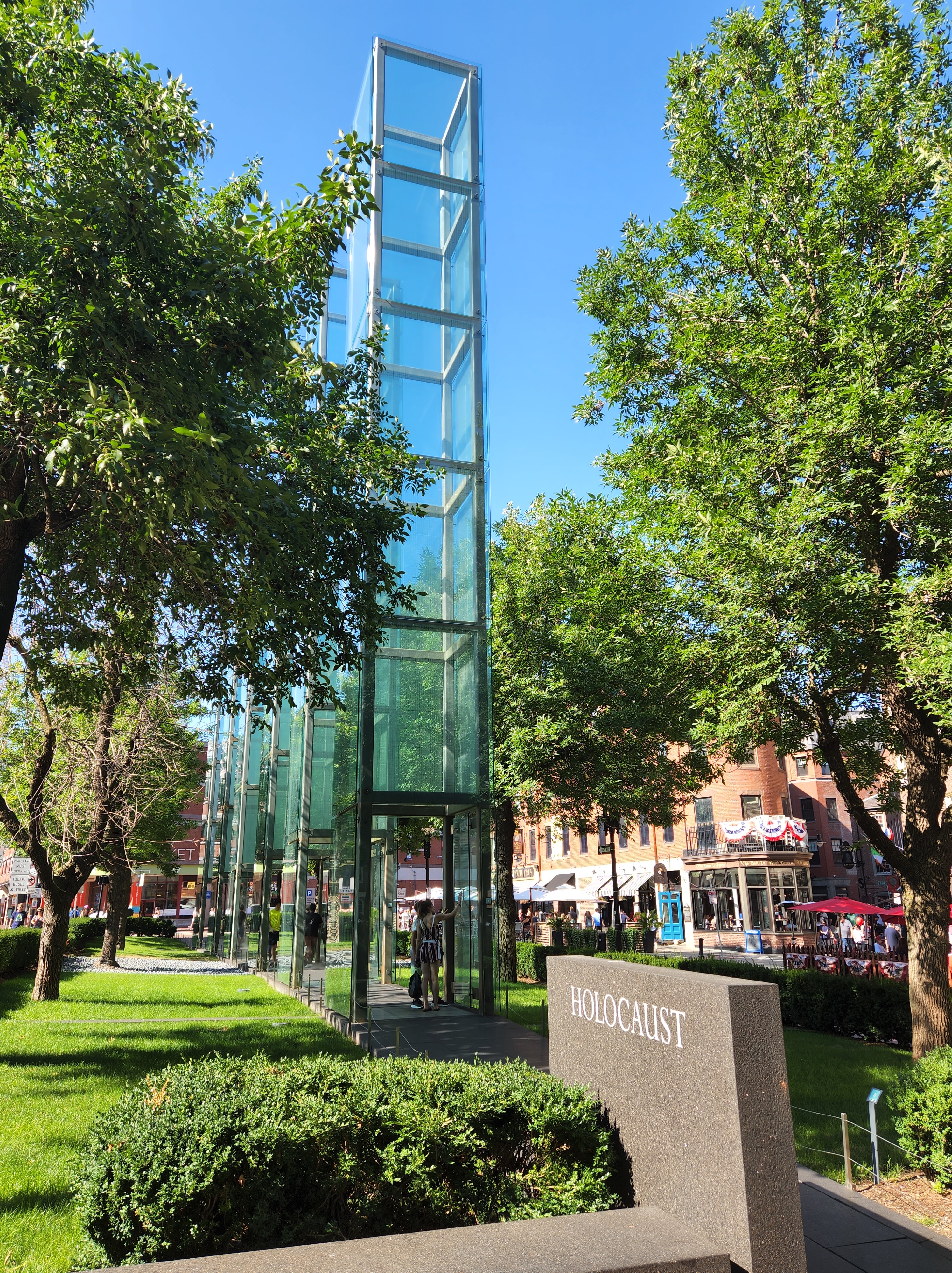 While walking to the North End we caught a glimpse of the Holocaust Memorial which was so intriguing that we returned the next day for a closer look. I’m so glad we did as this tribute was exceedingly impactful. The six 54′ towers represent the 6 million Jews killed, the 6 main death camps, and the 6 years in which the “final solution”, the most deadly phase of the Holocaust, took place. Etched on the glass walls are the numbers of the tattoos on the arms of the victims. The horror is represented by the brutal cutting of the trees on half the site with the stumps remaining. As one walks into each tower the hot steam is felt rising up from the pit dug beneath that’s filled with a burning fire. This sobering experience had a powerful and lasting effect on us.