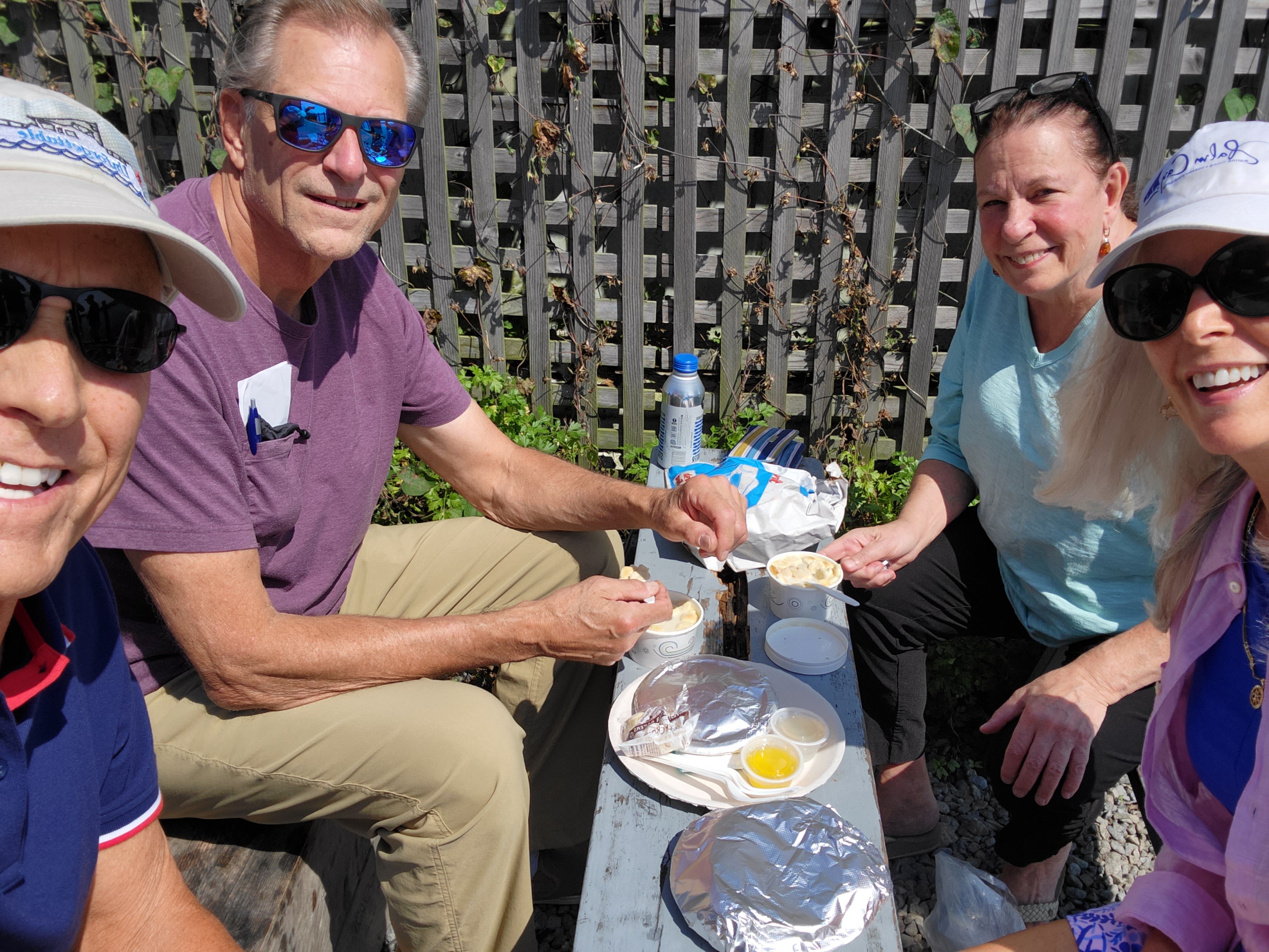 After a summer of fabulous weather and no hurricanes it all changed on Labor Day as we traveled to Martha’s Vineyard. Cool temperatures, clouds, winds, and drizzly weather set in just as if fall suddenly arrived in a single day. We went to shore for dinner the first night then stayed home in Lagoon Pond for the next 2 days. Scott had plenty of chores to do that had been postponed while we had been playing every day. I felt like snuggling into a sweatshirt and nesting. When our friends Bridget and Mike, along with their son Nick and future daughter-in-law Arta, arrived at their beautiful home on a quiet single-lane road we had two great days together. I do believe the best lobster rolls are at Larsen’s Fish Market in Menemsha where we also tried one of their stuffies, a quahog in its shell with stuffing. They introduced us to the Obama’s favorite restaurant on the island…The Sweet Life Cafe. I can understand why The Sweet Life Cafe is Obama’s favorite…our dinner was fabulous! Mike and Bridget drove us throughout the island introducing us to the beautiful woods and farms, far from the tourists. On our final evening, after a short walk to the southern beach, Nick prepared an exquisite salmon dinner. Thank you for your hospitality Bridget, Mike, Nick and Arta!