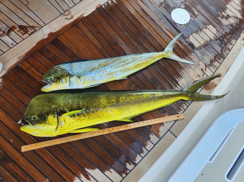 On our way from Chub Cay to our anchorage at West Bay, New Providence I didn’t have high hopes of catching a fish as it was much deeper water than we usually fish in and there were some good size swells. When we catch a fish we have to slow down the boat in order to pull it in. Our stabilizers shut off when going under 5 knots so it can be difficult to function on the aft deck while rocking and bouncing. Scott put out our 2 lines anyway and in about 10 minutes were heard the high pitched scream of the line being pulled and the excitement began! He started reeling it in and ten minutes later the other line took off! He pulled in a nice size female with a shark trying to catch her from behind. I worked and worked until I couldn’t lift my arms any more and Scott had to take. This one had been leaping and fighting like none other we had seen. Finally Scott gaffed him and plopped him onto the aft deck floor exhausted and so was I. Wow, this was one big boy! I admire the beauty of the fish that we catch and am mindful of their sacrifice as we dine on excellent grilled fish dinners!