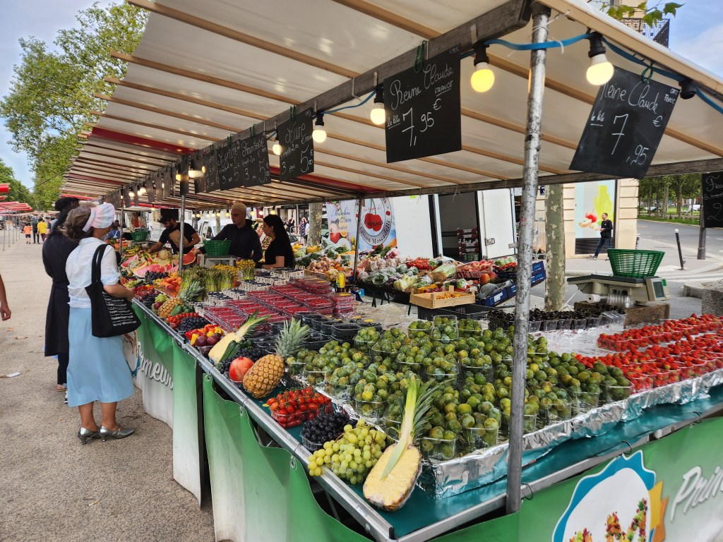 Paris was exhausting. We walked for miles upon miles throughout the city but enjoyed every experience on the streets. Our apartment in Paris was near the Eiffel Tower and the nearby fabulous farmers market was where we ate the wonderful Reine Claude plums then the even more delicious Mirabelle plums. Unfortunately, true Mirabelle plums can only be grown in France or I would eat them every day. It was nearly impossible to eat plant based especially when meats, specifically tartares and patés were highlights of the menus. I did enjoy the escargot, bouillabaisse, and quiche but was unimpressed with the macarons and pain du chocolat which was superior in the chocolate croissants in Switzerland and the cornetti in Italy. We attempted to consume all our meals at the cozy, tiny tables of sidewalk cafés.