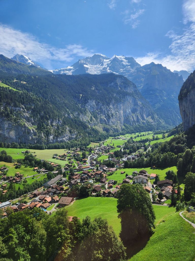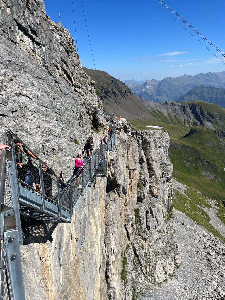 The Schilthorn mountain which sits above Mürren is where one actually gets the best view of the village of Mürren. Look carefully in the picture on the right to see the tiny houses down below. At the top of the Schilthorn we learned about the making of the 007 movie there , “”On Her Majesty’s Secret Service”, and experienced the Thrill Walk where we traversed the glass bottomed platform and a tight-rope that clung to the side of the mountain. Quite the thrilling day as we were also able to see Mont Blanc, in France.