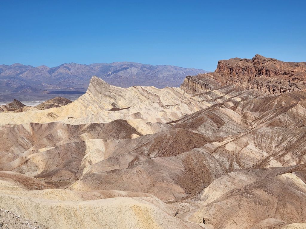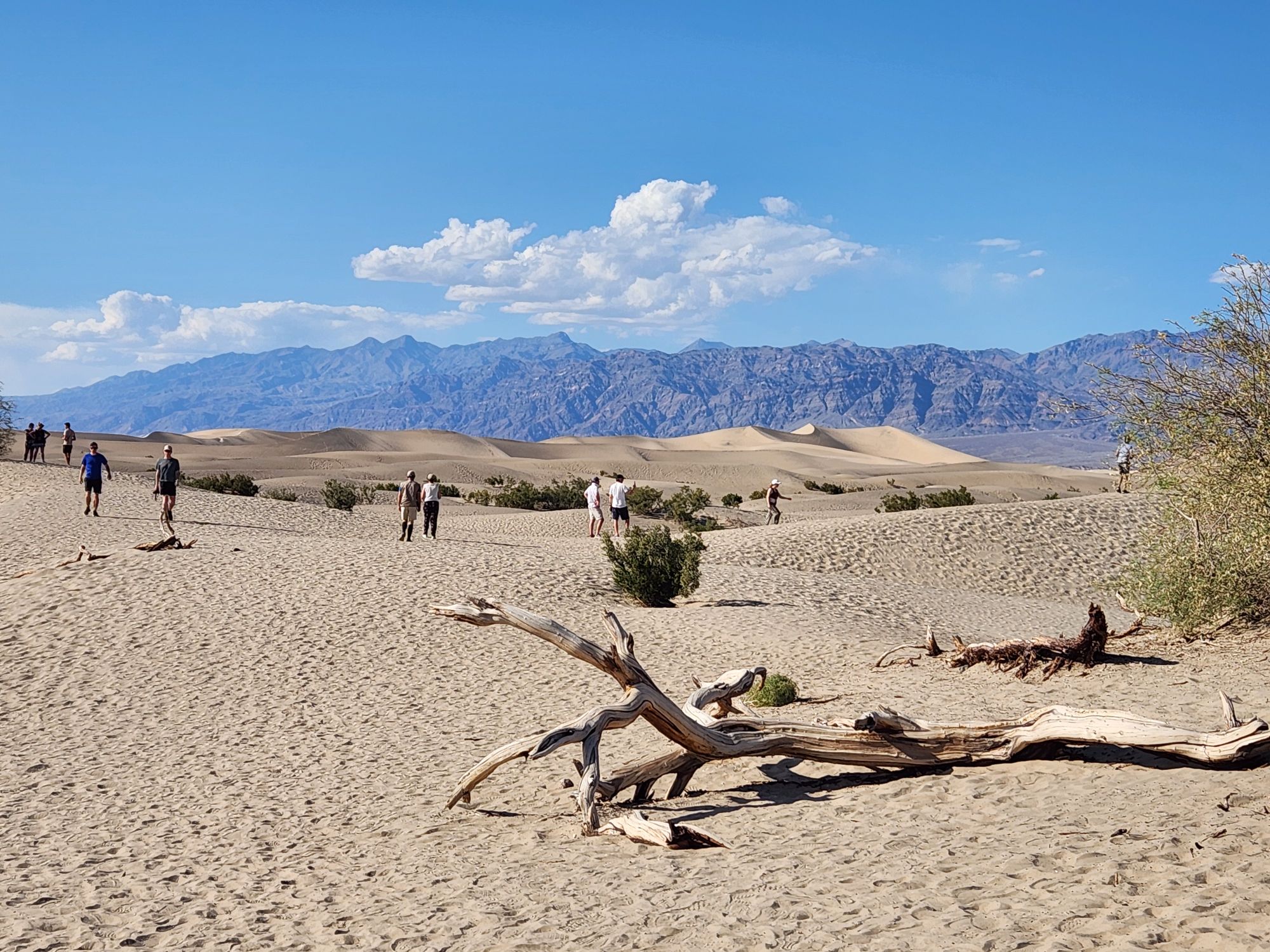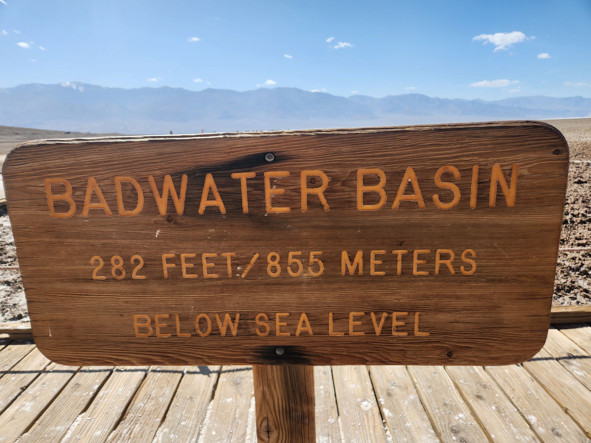 Upon entering the national park we walked on the sand dunes and admired Rainbow canyon where air force training flights took place (it looked like Top Gun: Maverick). We learned about the important role of borax, its production site and townsite, now a ghost town, and how it played an important role in the history of Death Valley. We saw some of the original 20-Mule Team wagons and associated machinery that was used prior to trains. We walked in Badwater Basin, the actual location of the lowest point, across the expansive salt flats. Death Valley is in a rain shadow, meaning that the storms approach from the west and the rain is squeezed out in the mountain ranges prior to reaching the valley. Last August the remnants of Hurricane Hillary dropped a year’s worth of rain, 2.2″, in one day and a lake was formed which is still there today. So interesting that the smallest amount of rain there can cause major floods.