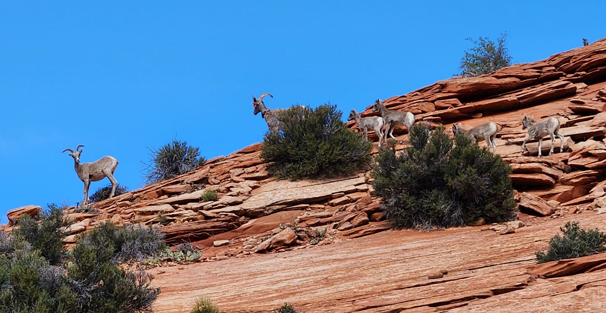 The cute little town of Springdale, UT was where we stayed in a little authentic log cabin. We spent 2 days exploring Zion National Park and observing the crazy…I mean brave, folks climbing/rappelling vertical rocks. For several days we had been commenting that we really would like to see a big horn sheep. To our delight, we watched 12 Desert Big Horns right by the road as we were leaving the park! We sat for quite some time observing and shooting tons of pictures while they did their thing.