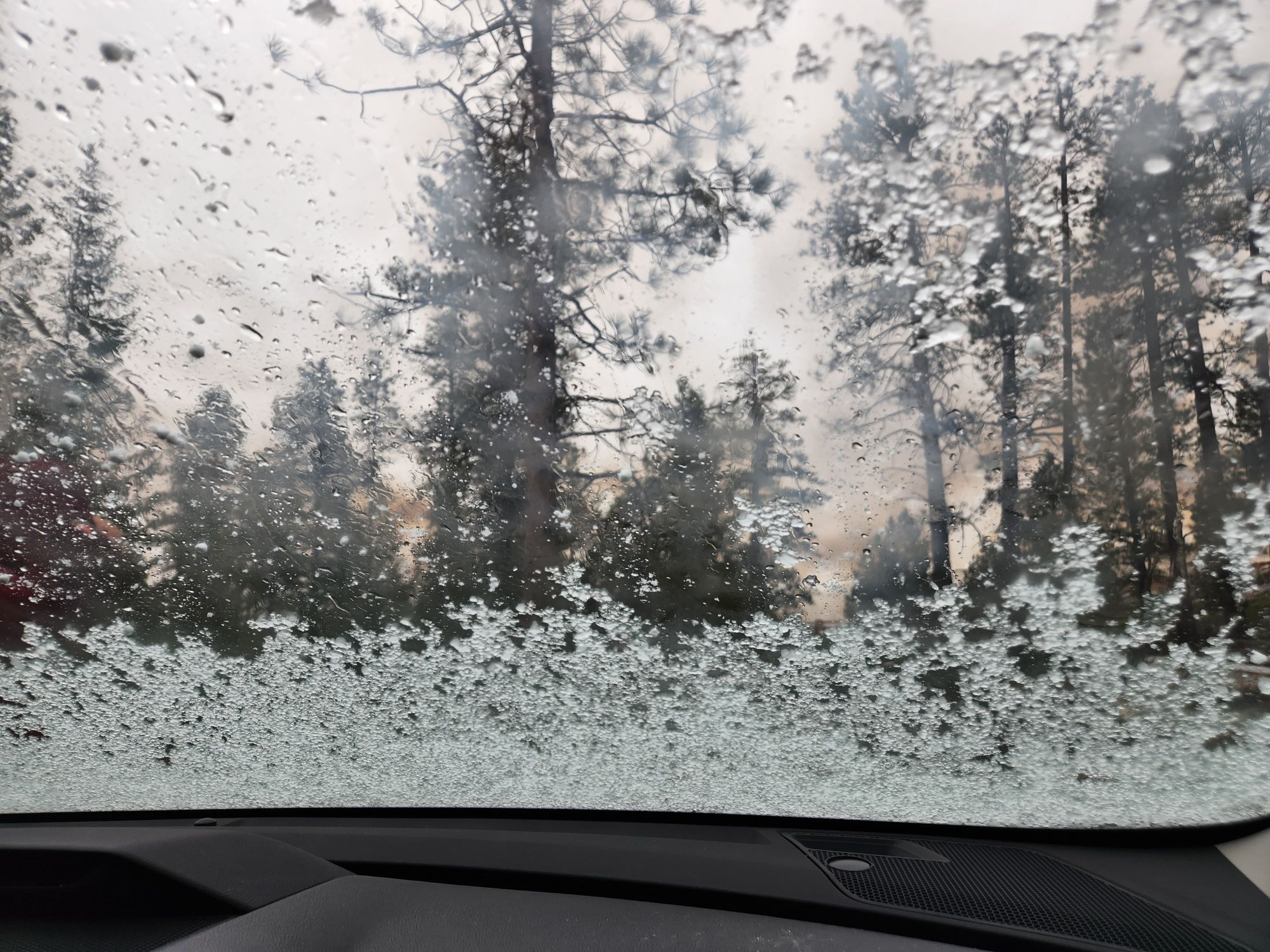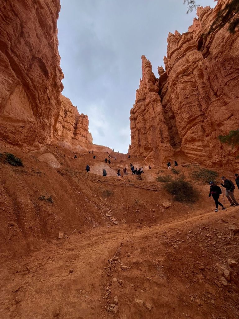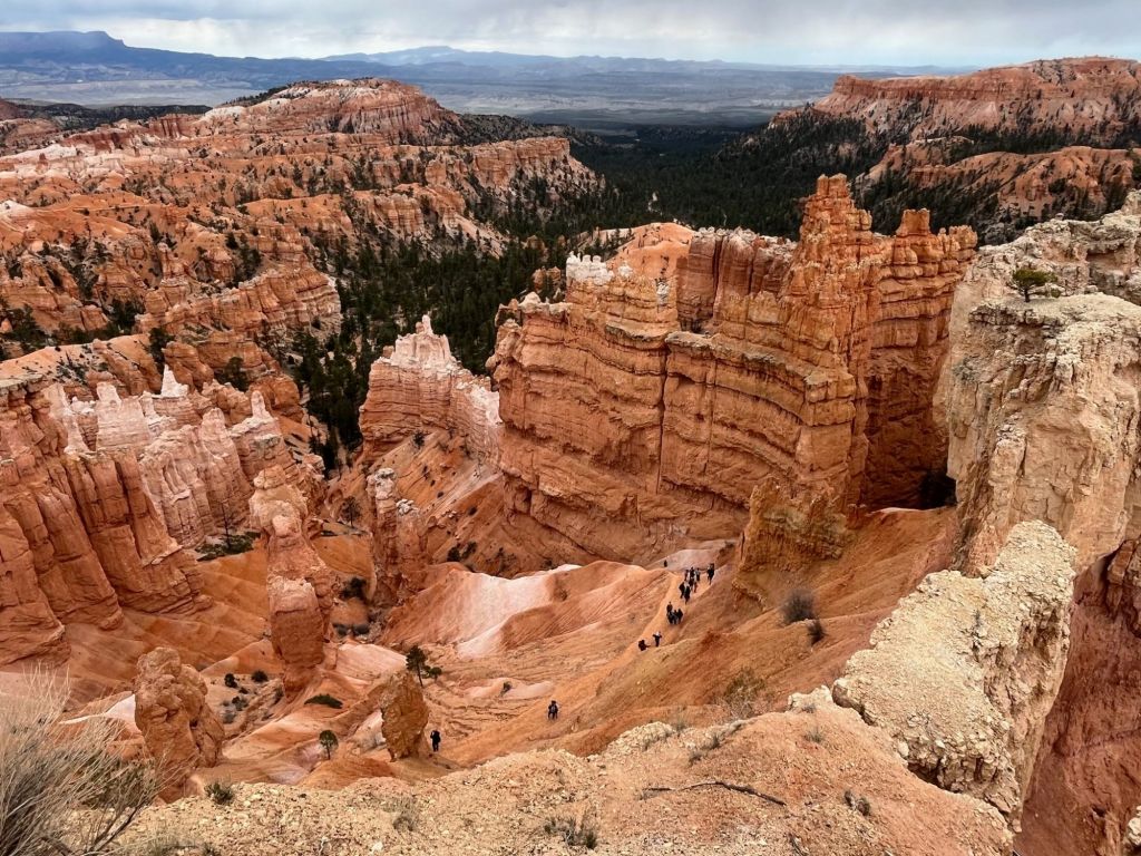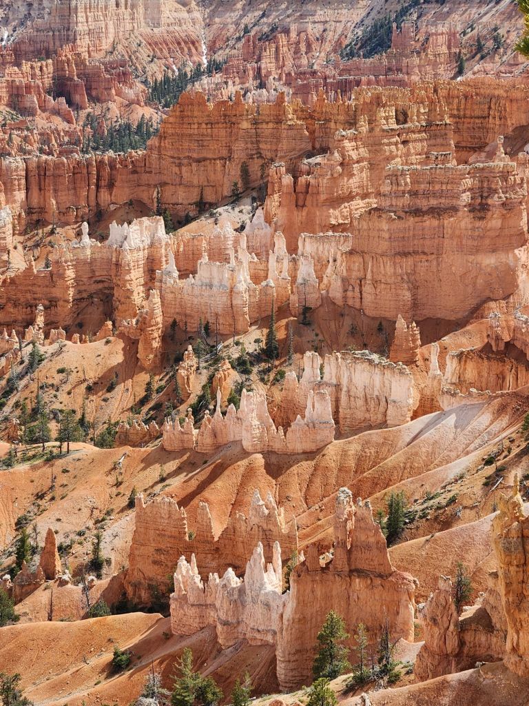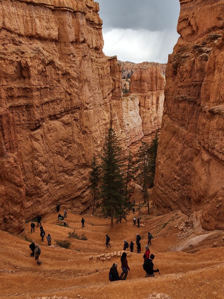 We spent two days in Bryce Canyon and each day blew my mind, in fact, I was more impressed with Bryce than with the Grand Canyon. We took two vigorous hikes down among the hoodoos (tall, thin spires of layered rock formed by erosion). There are many signs in the park explaining that in case of thunder go quickly into the lodge or into your car. Just as we got to the bottom of the Navajo Trail we heard thunder. Boy, did we huff and puff quickly back up the 800′ drop in elevation. We scrambled into the car just as a massive quantity of ice pelted us. Both days we were in the park we had periods of sun, rain, sleet and snow but that didn’t dampen our spirits nor our love for these colorful and unique formations. An interesting tidbit…Bryce canyon isn’t actually a canyon; it’s a series of amphitheaters or bowls carved into the edge of a high plateau carved by erosion. Canyons are formed by rivers. We took more pictures in Bryce than we have any place else on this trip. The pictures vary greatly depending on the location of the viewpoint.