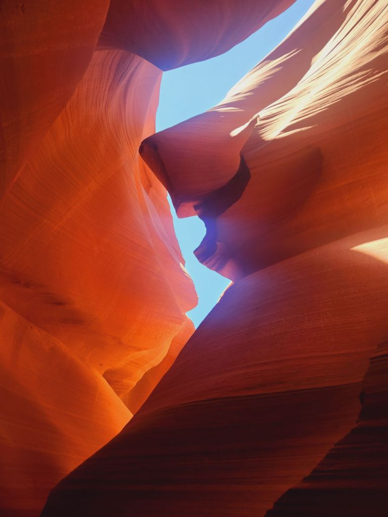 We traveled along the Vermillion Cliffs and saw some odd rocks precariously perched atop other rocks. Antelope Slot Canyon is located in the Navajo Nation and is a pretty amazing narrow crack in the flat desert formed over millions of years by floods rushing through the sandstone. We walked underground for 1335′ on a path as narrow as the width of my foot . Our guide was kind enough to give us tips on taking better pictures with our cell phones and took pictures of the two of us. The light streaming down into the slot created some cool photos. In actuality, it was impossible to take a bad picture in there. Horseshoe Bend is another famous spot in Page but we only took 2 pictures as the water in the Colorado River there was green and not too photogenic.