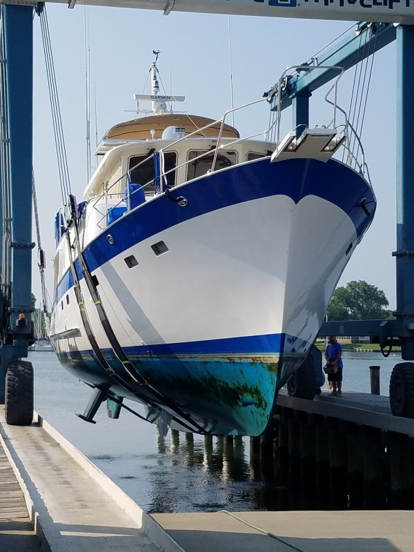 Unforgettable got all gussied up this past two weeks! She weighs in at 100,000 lbs. with tanks half full so it takes a huge travel-lift to lift her big bottom out of the water! Prior to being pulled out of the water she had to be inched up to the ground to remove both... Continue Reading →